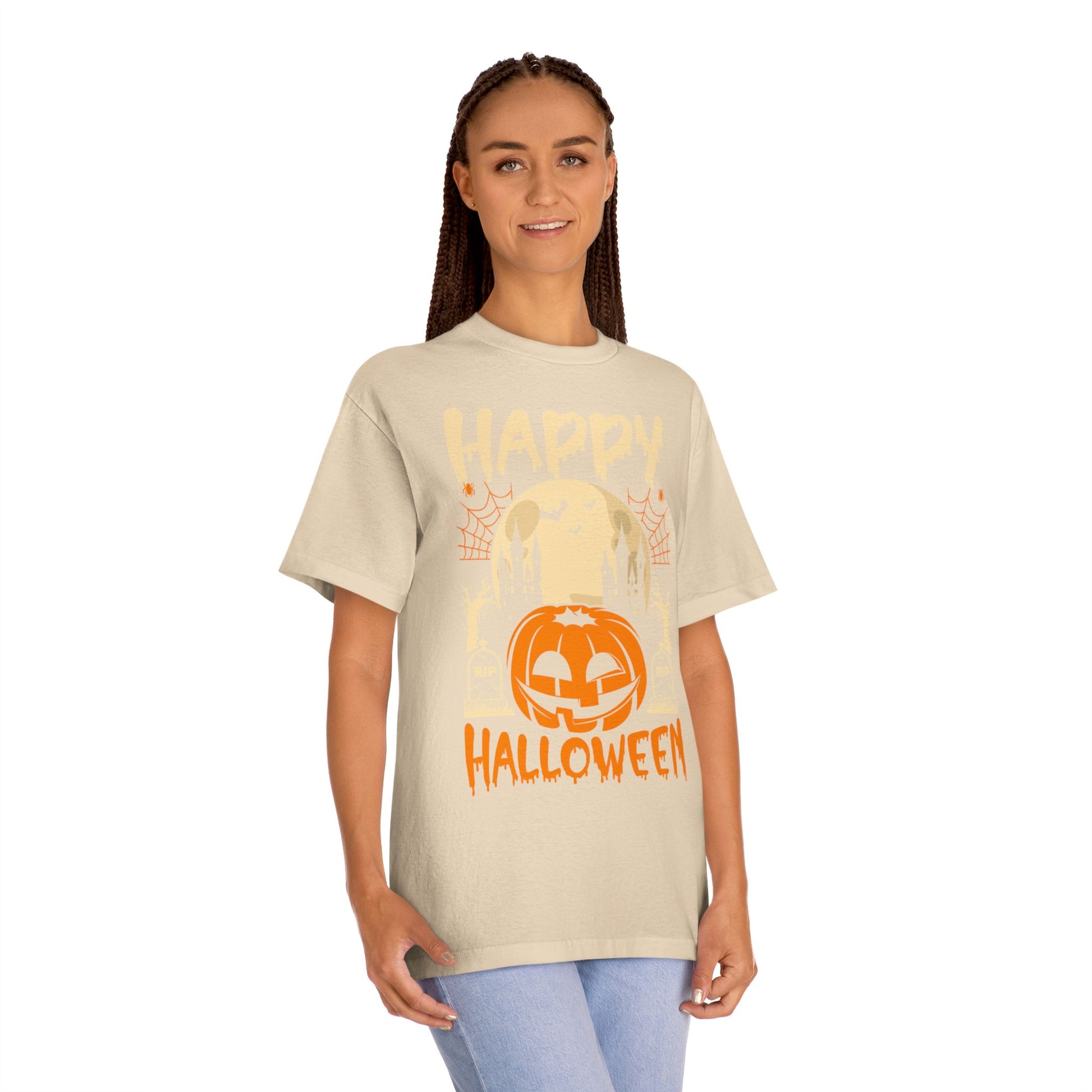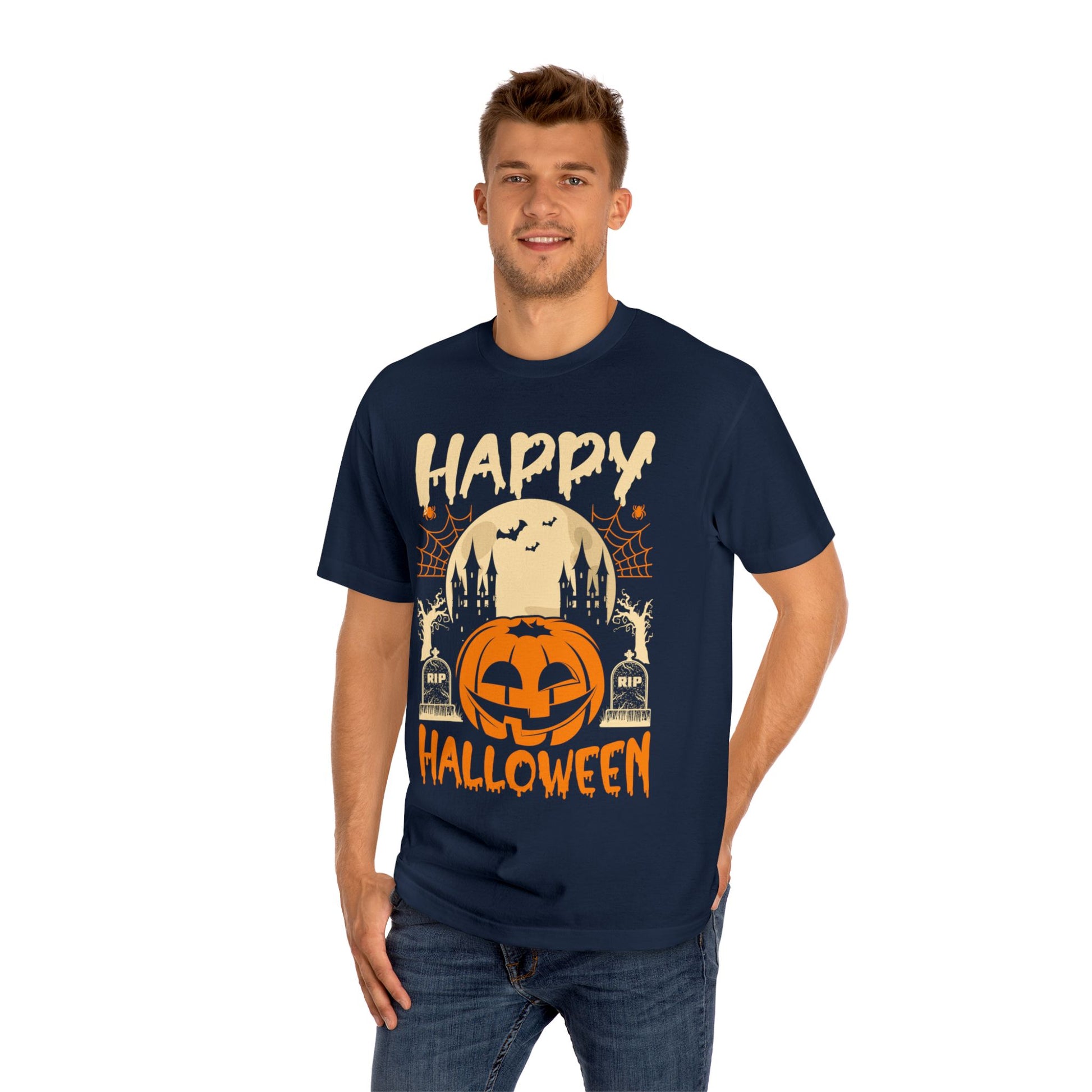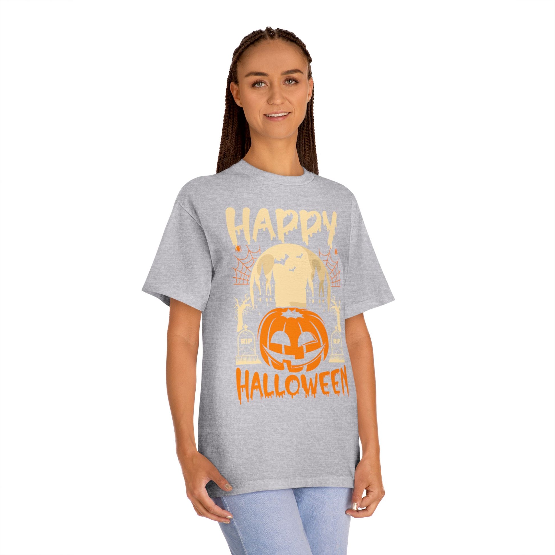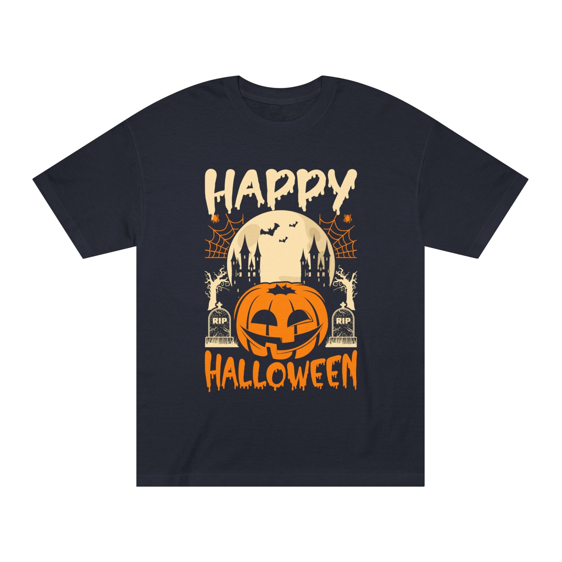 Celebrate Halloween in comfort and style with this Happy Halloween graphic t-shirt. Featuring a bold pumpkin jack-o’-lantern, haunted castle, bats, and full moon, this shirt is perfect for trick-or-treating, haunted house parties, or just spreading festive vibes all October long.